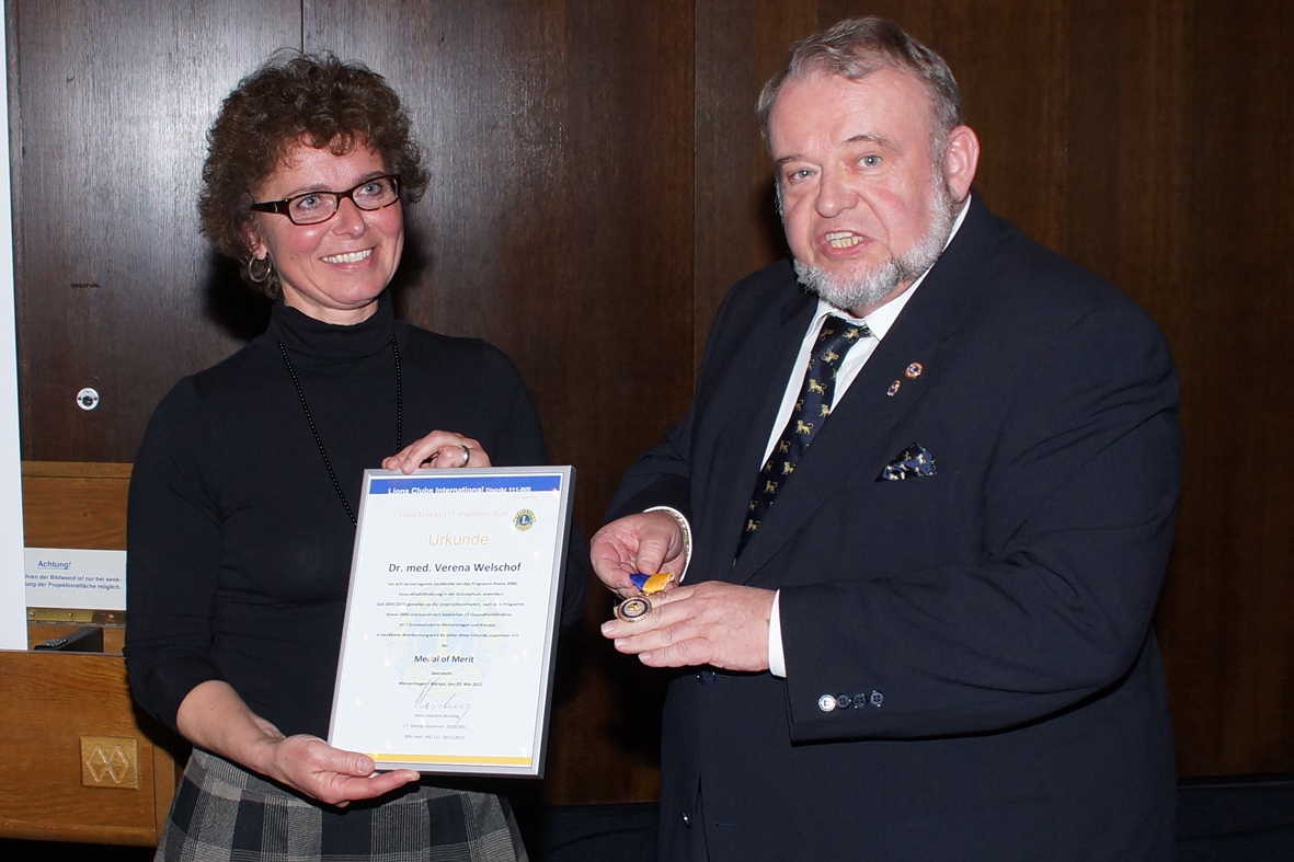 Verena Welschof hat sich hervorragende Verdienste um das Programm Klasse2000 Gesundheitsförderung, Sucht - und Gewaltprävention in der Grundschule erworben. Seit 2001/2002 gestaltete sie die Unterrichtseinheiten nach dem Programm Klasse2000 des Klinikums Nürnberg und koordinierte über die Jahre bisher 20 Gesundheitsförderer an allen Grundschulen in Meinerzhagen und Kierspe. Bei zu Beginn etwas zäh fließenden Finanzierungsmitteln für das bundesweit führende Gesundheits-Programm kam unserem Lions Club in 2005 die Auflage eines Adventskalenders zu Hilfe. Nach 10 Jahren konnte der Club mit über 50.000 verkauften Lions-Kalendern auf eine Erfolgsstory verweisen und neben dem Programm Klasse2000 sogar noch andere soziale Einrichtungen fördern und unterstützen. Am 3.Mai 2012 - Im Rahmen einer kleinen Überraschungsparty im Foyer der Stadthalle Meinerzhagen mit den von Verena Welschof betreuten Gesundheitsförderern - verlieh ihr der GRV elect Heinz -Joachim Kersting den sehr selten vergebenen Orden „Medal of Merit“ für besonders verdiente Personen, die die Ziele von Lions besonders unterstützen und der Lions-Idee sehr nahe stehen. Als Anerkennung für ihre wertvolle Unterstützung und als Dankeschön für ihren unermüdlichen Einsatz für das Programm Klasse2000 erhielten die Gesundheitsförderer aus der Hand des P Peter-Wilm Pfitzner je einen weißen Porzellan-Löwen mit dem Lions-Logo. Die Gesangsgruppe „The Albert Singers“ mit über 20 Sängerinnen und Sängern und dem Chorleiter Matthias Ortmann machte die Überraschung perfekt.